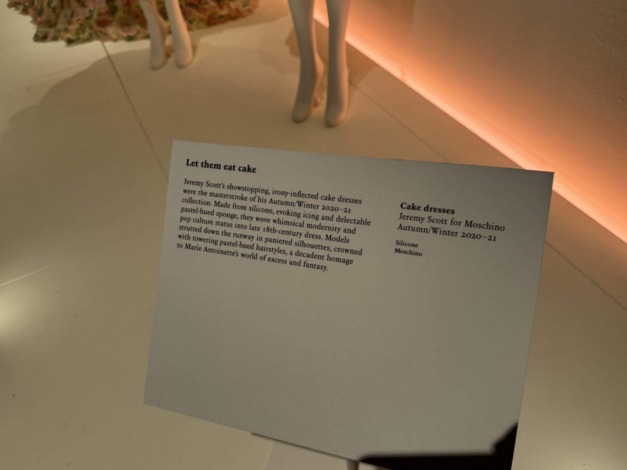 Шедевр осенне-зимней коллекции 2020-21 года Джереми Скотта — это потрясающие, ироничные платья-торты. Изготовленные из силикона, напоминающего глазурь и восхитительный бисквит пастельных оттенков, они вплели причудливую современность и статус поп-культуры в одежду конца XVIII века. Модели дефилировали по подиуму в платьях с панелями, увенчанных высокими прическами пастельных тонов — декадентская дань уважения миру излишеств и фантазий Марии-Антуанетты.