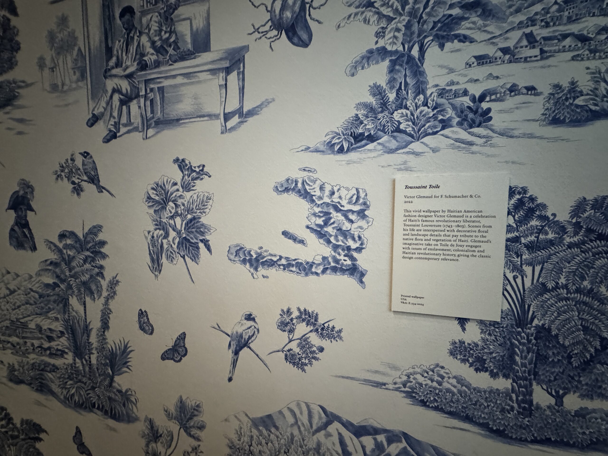 Эта картина в стиле «Туаль де Жуи» изображает воображаемую, расистскую колониальную сцену с хижинами, каноэ и фигурами, танцующими вокруг «Древа Свободы» — символа, впоследствии ставшего центральным элементом Французской революции. Флаги — один упрощенный американский флаг, другой — французский королевский штандарт — увековечивают роль Франции в Американской революции. Однако всего несколько лет спустя революционные идеалы бросили вызов собственной французской монархии и колониальному господству, что привело к таким событиям, как Гаитянская революция.