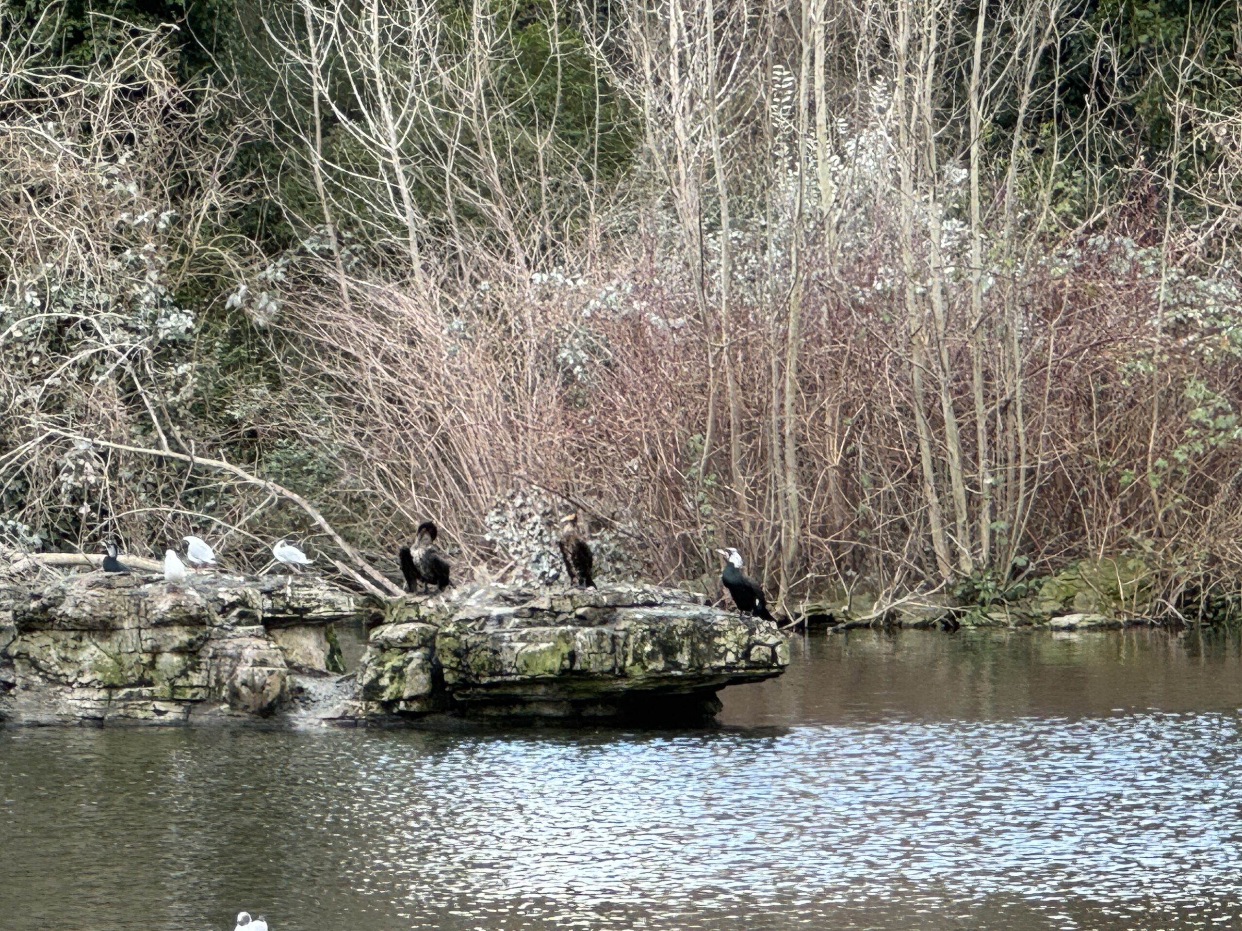 На озере сидят пеликаны и бакланы.