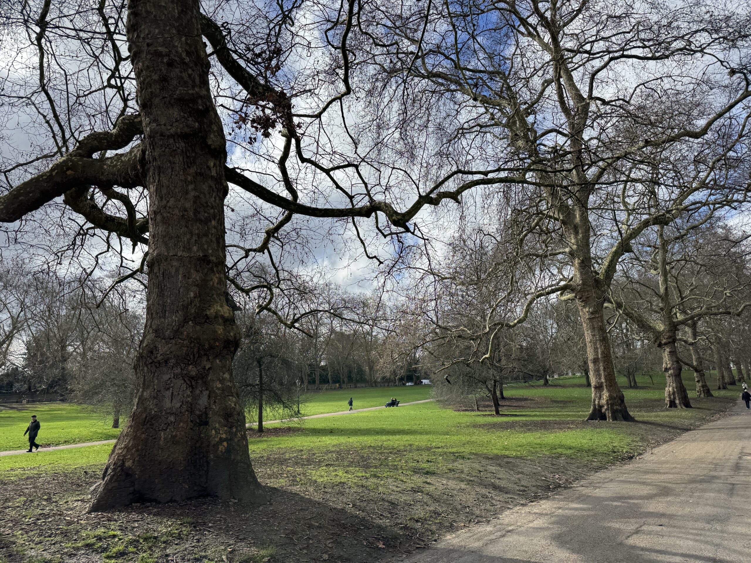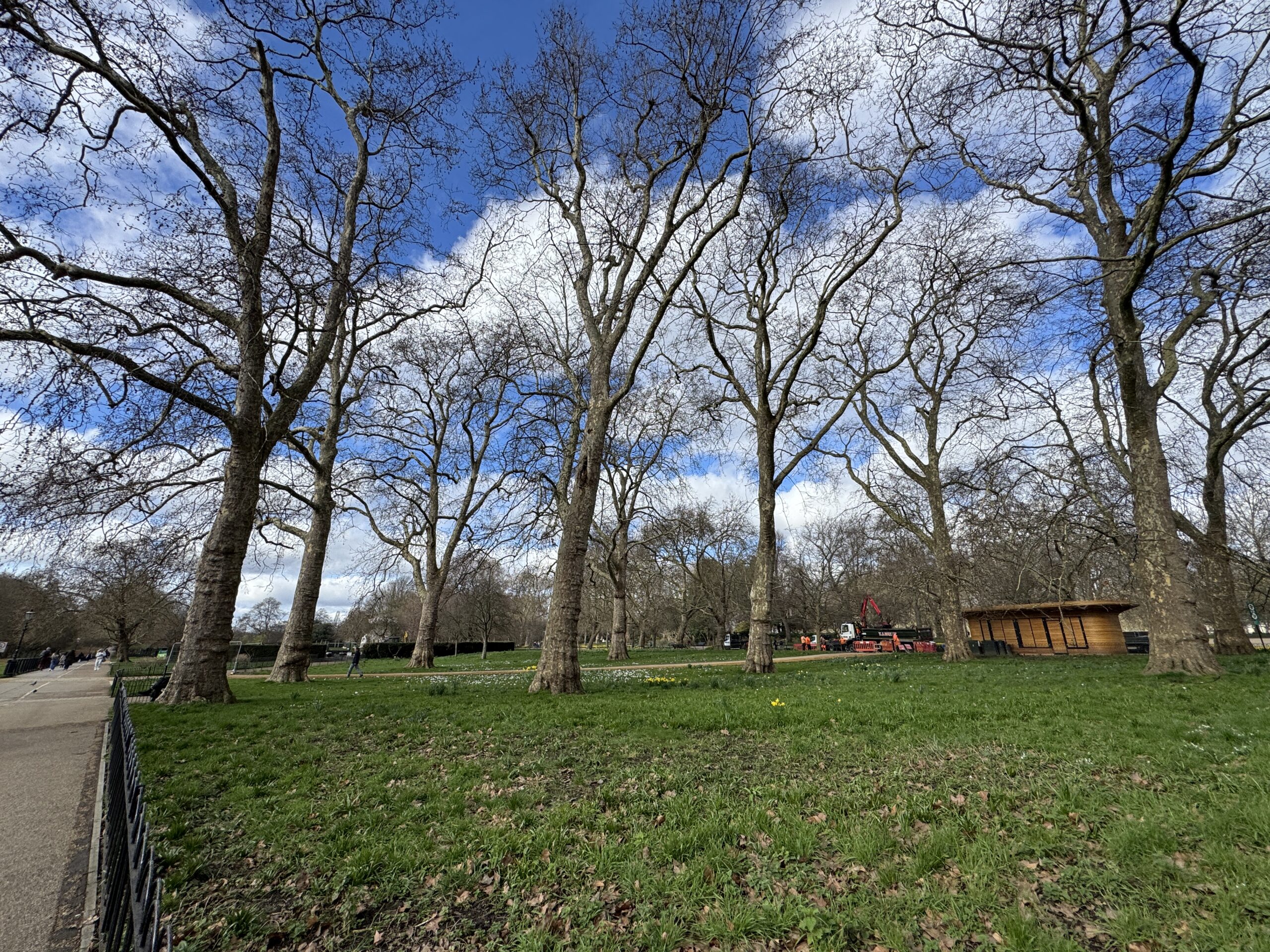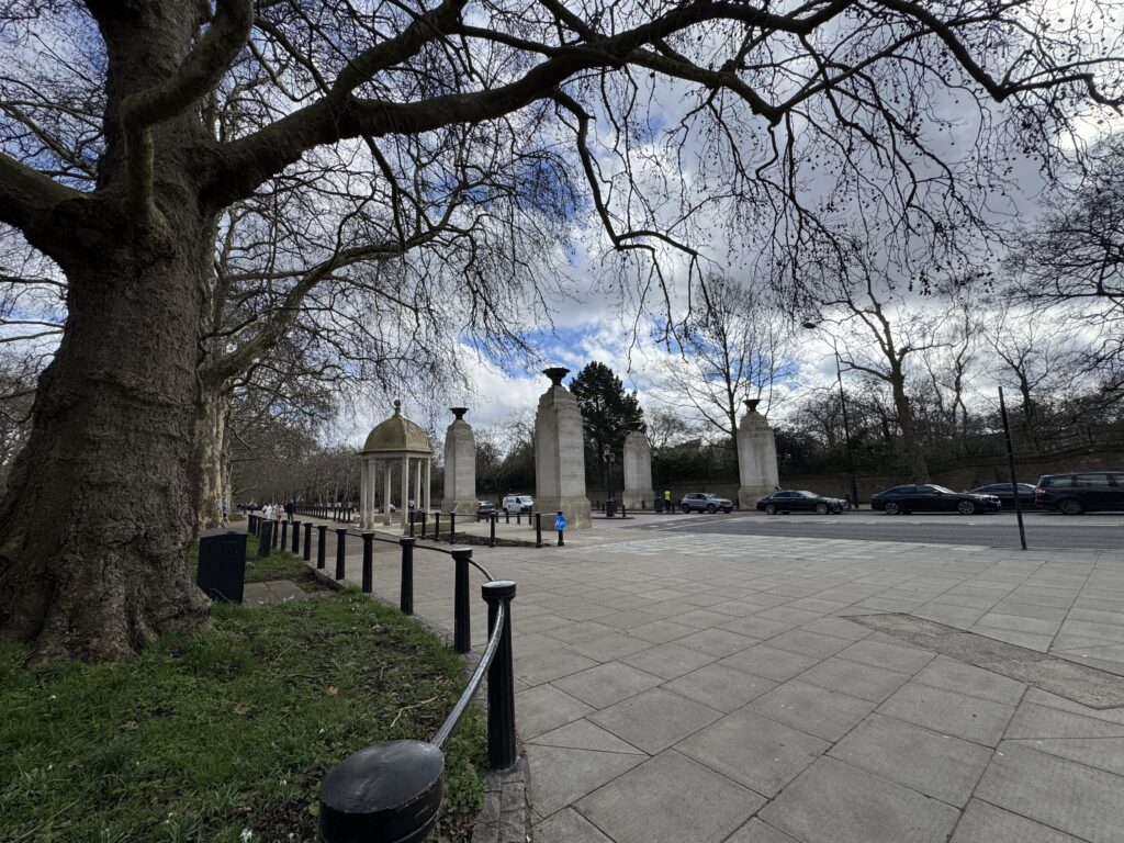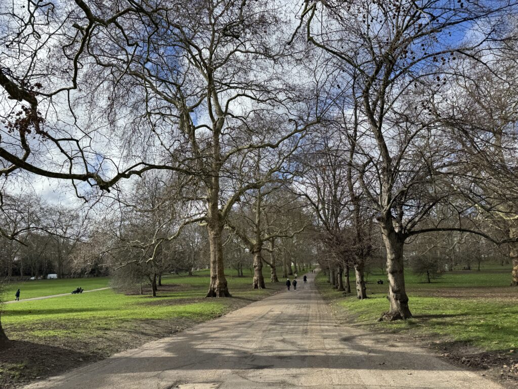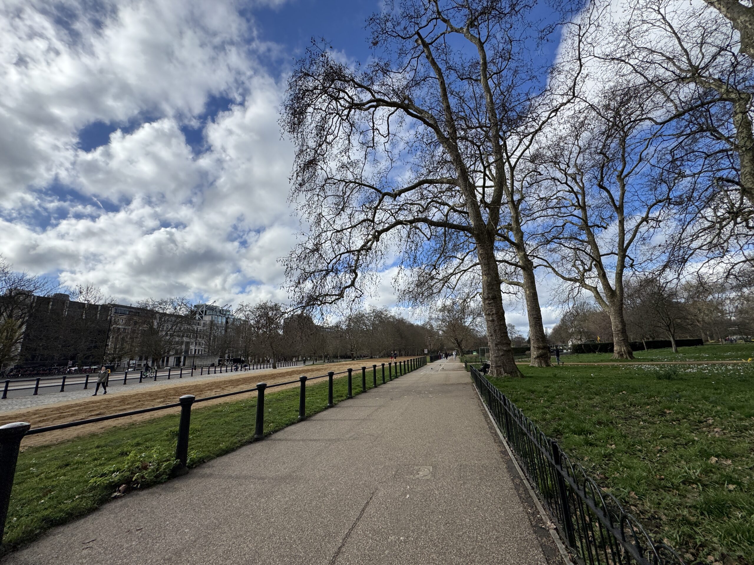 Гайд парк вдали. Здесь установлены светофоры со специальным сигналом для всадников.