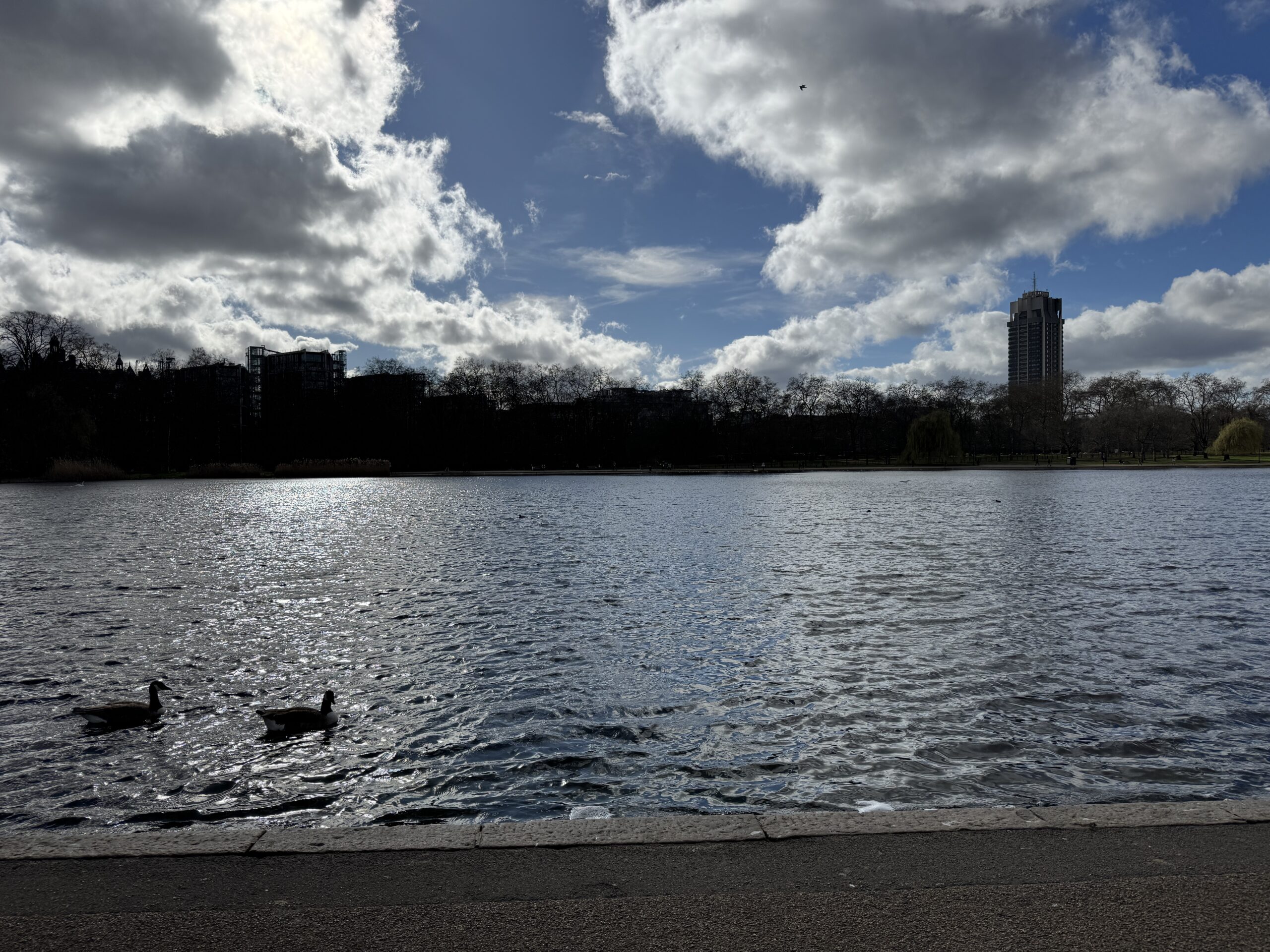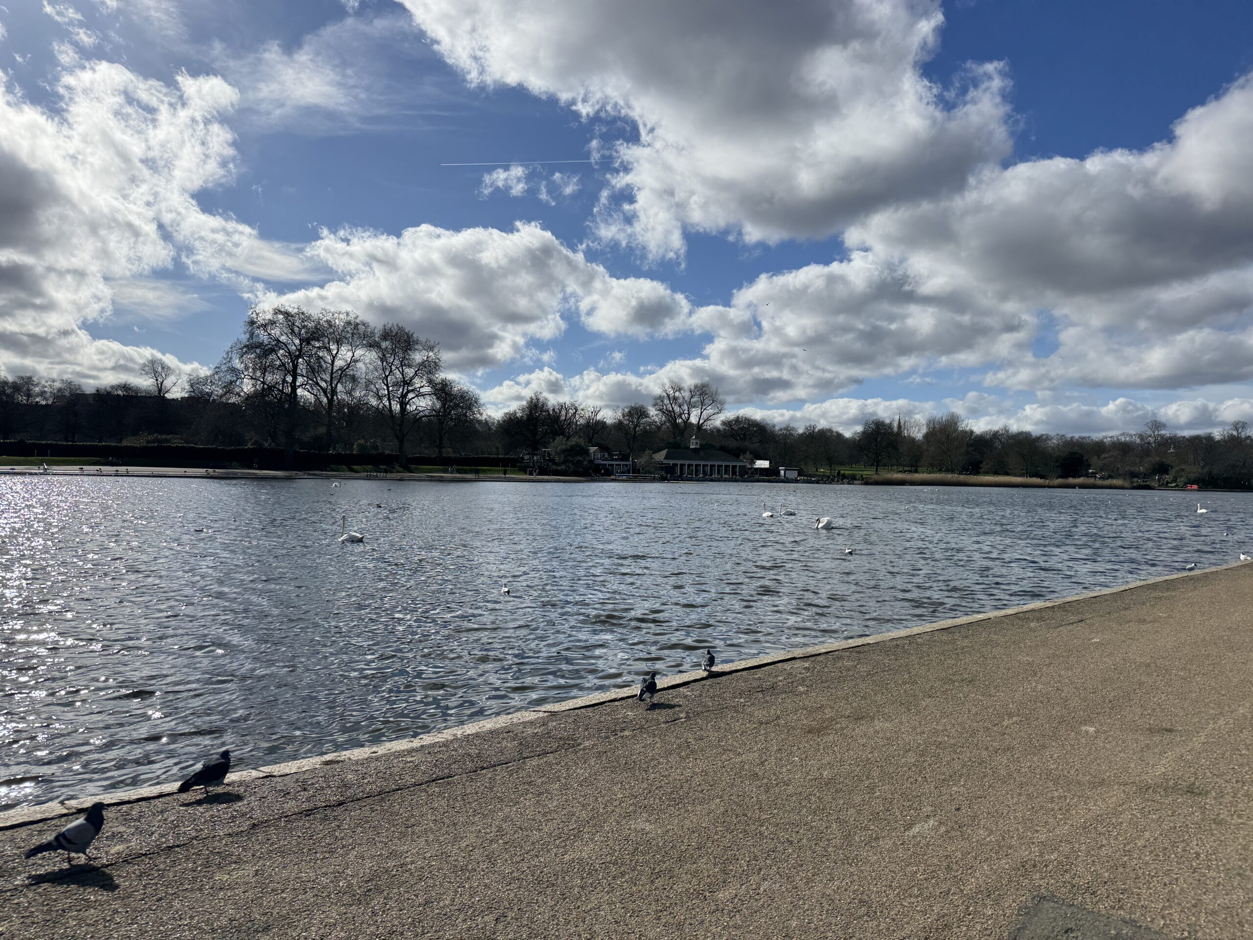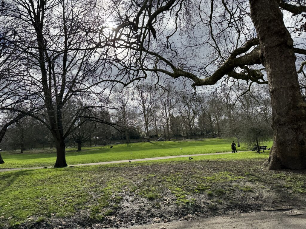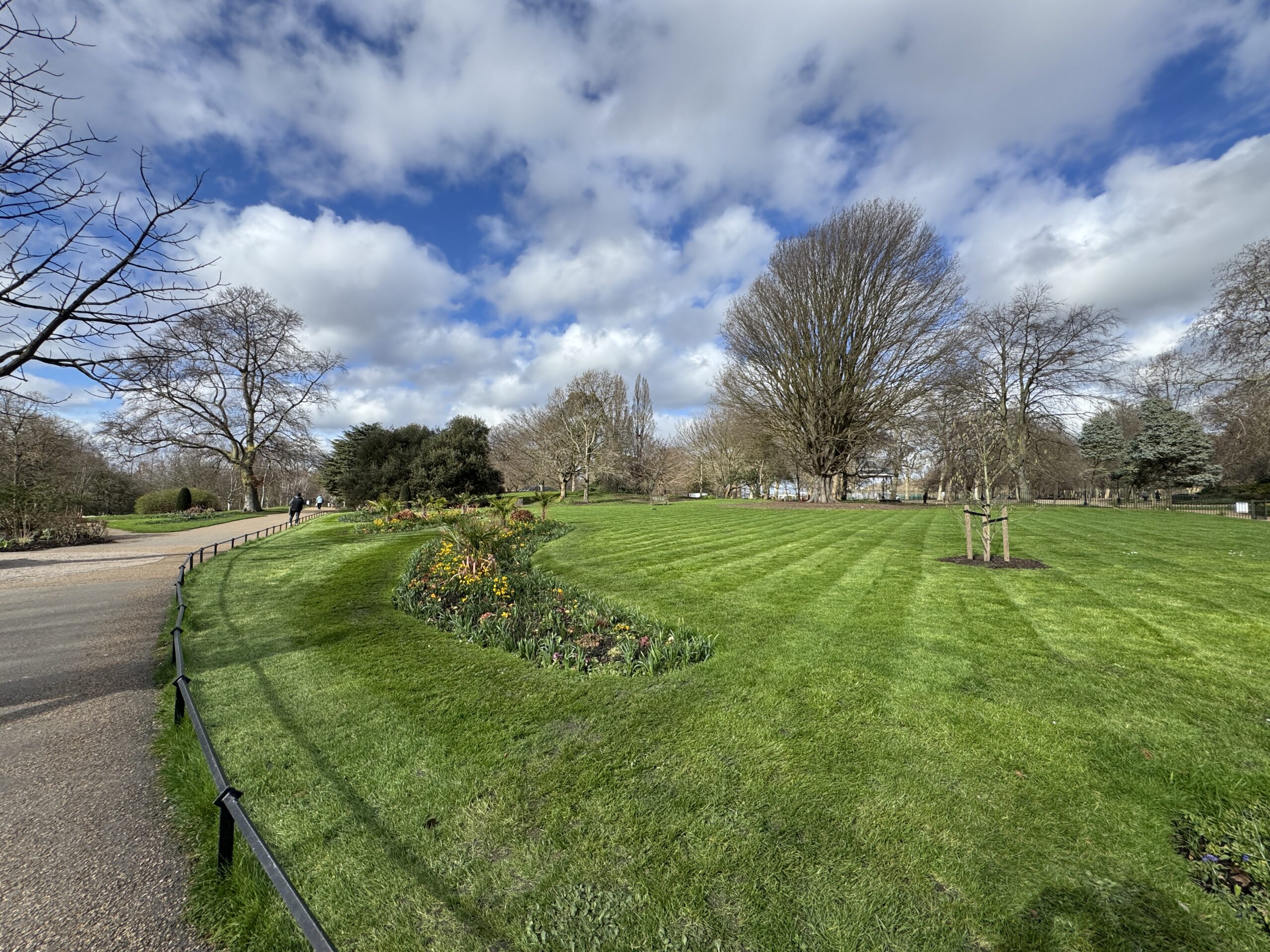 Гайд парк вдали. Здесь установлены светофоры со специальным сигналом для всадников.