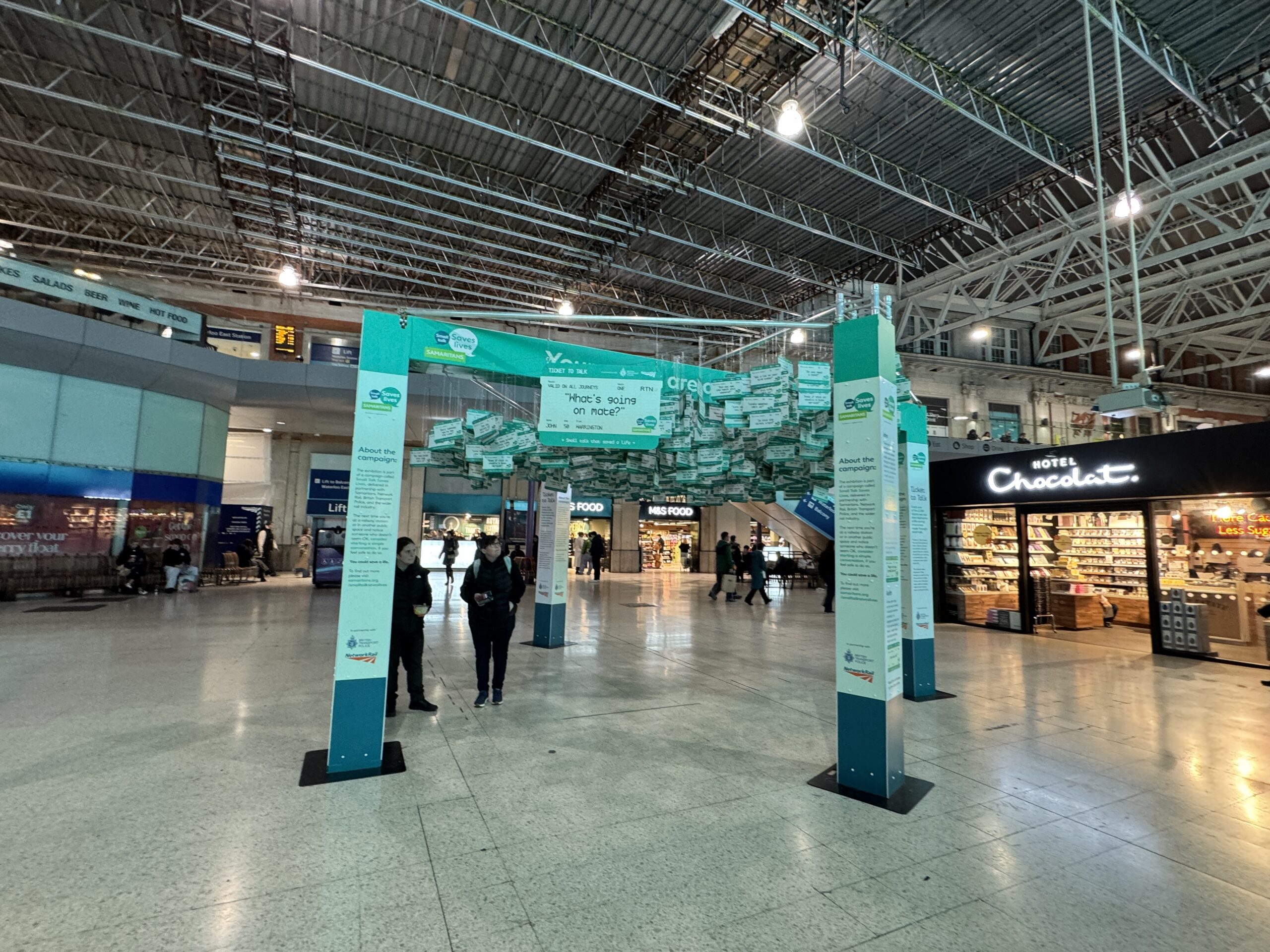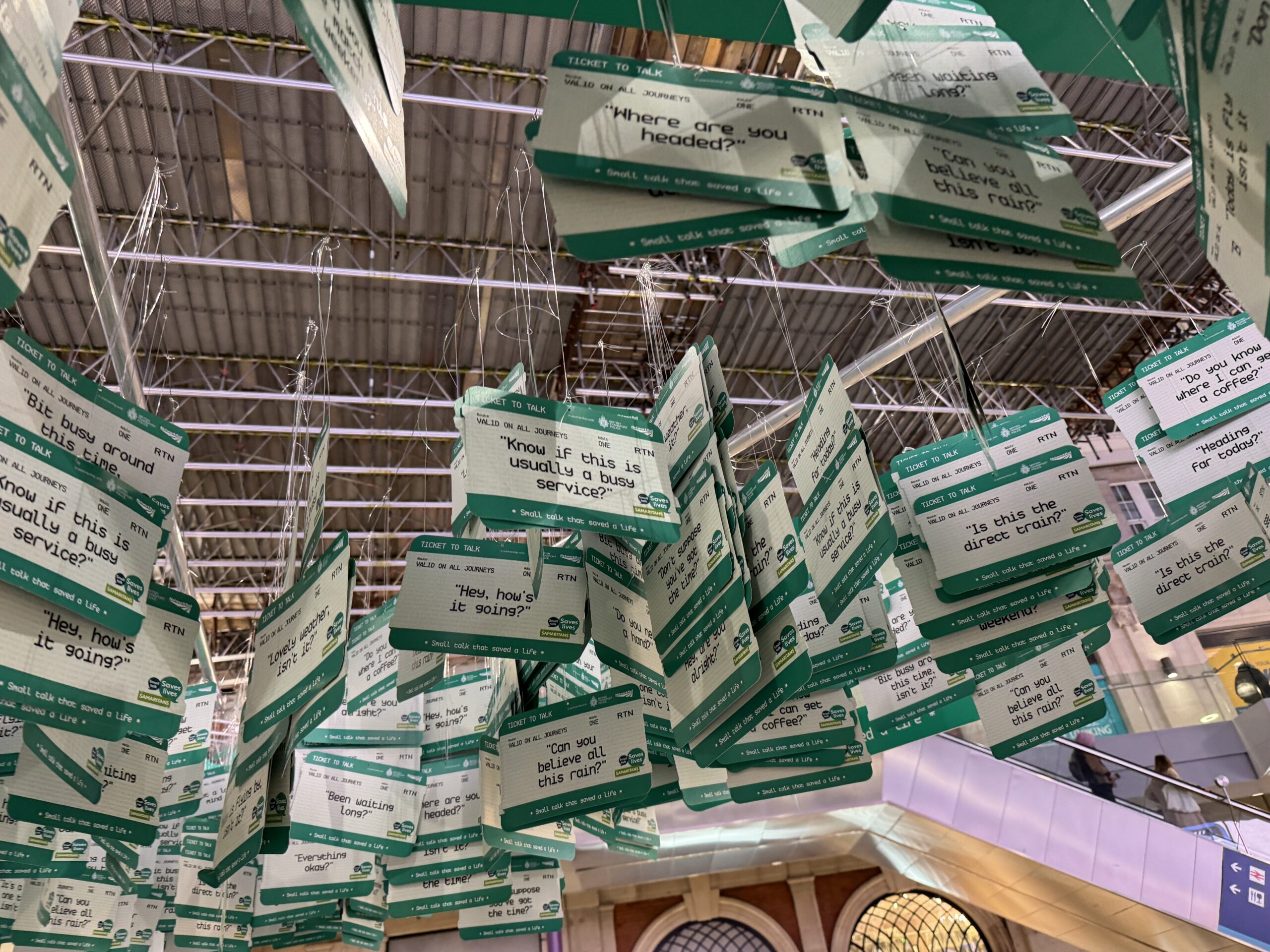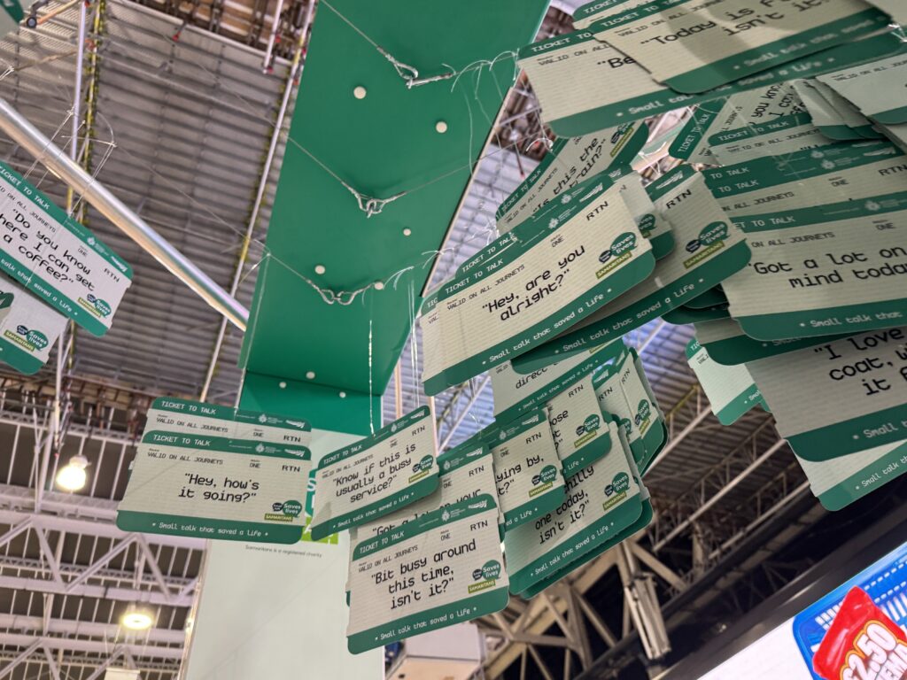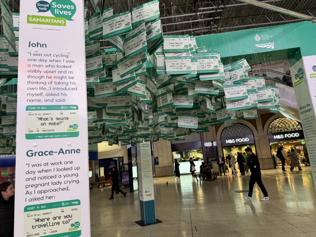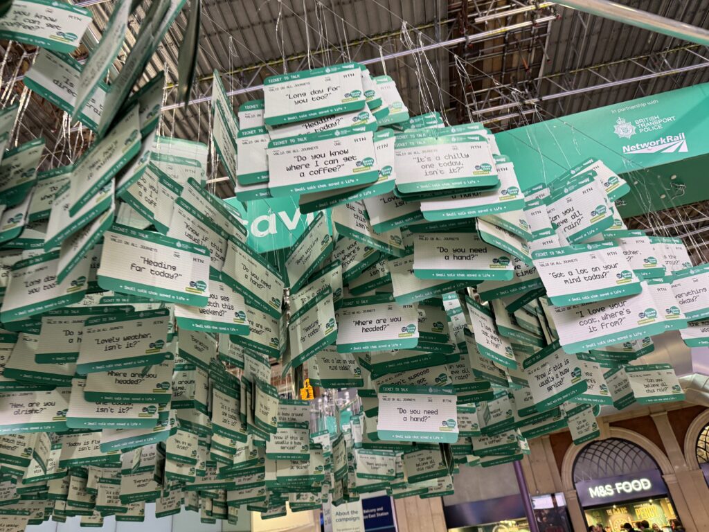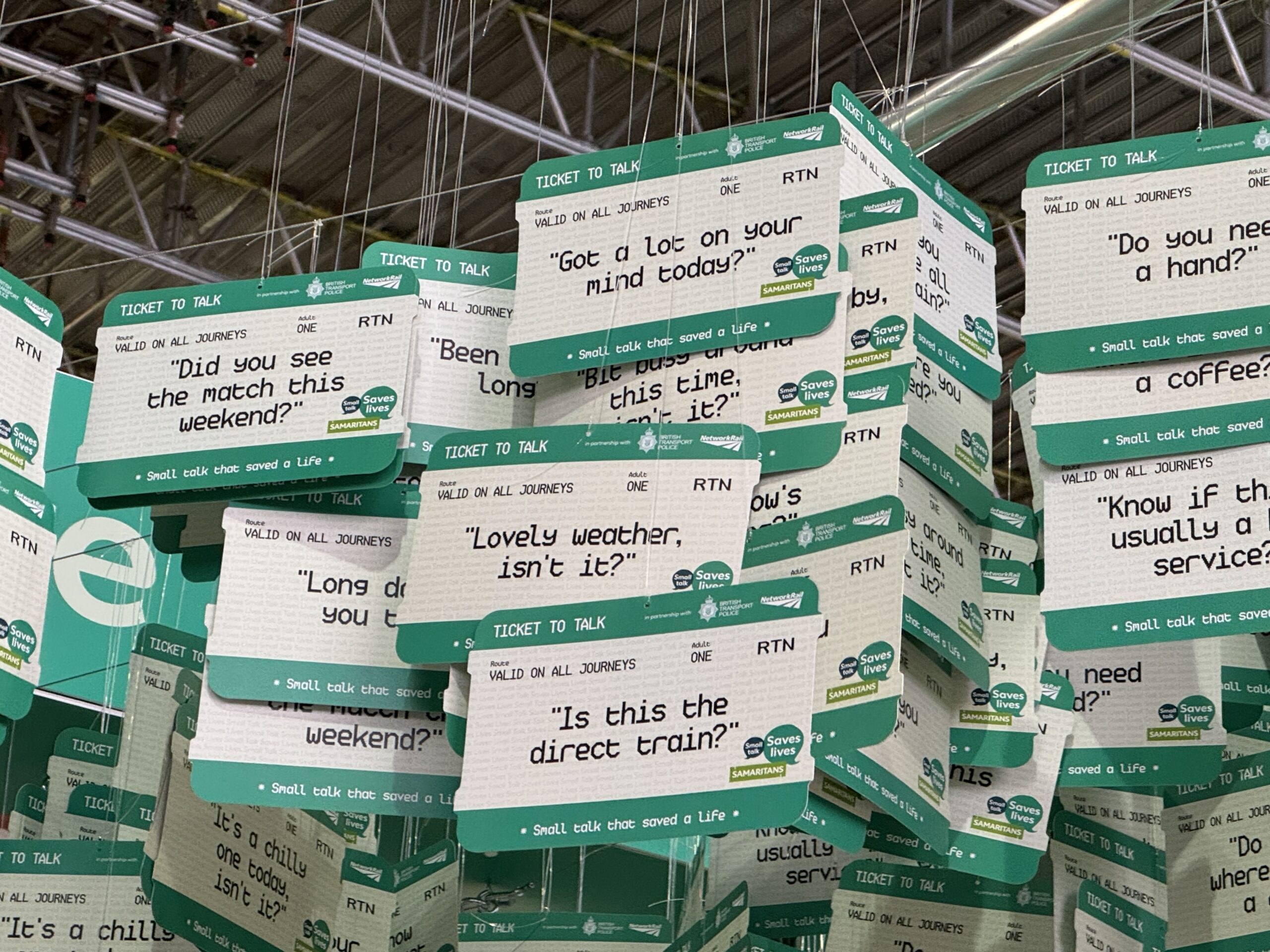 В этом году мы сотрудничаем с Network Rail и Британской транспортной полицией, чтобы представить наш информационный стенд «Билет на разговор» на станции Лондон Ватерлоо. На стенде представлены 2284 билета, символизирующие короткие, повседневные фразы, которые использовались на железнодорожной сети в прошлом году для спасения жизни.