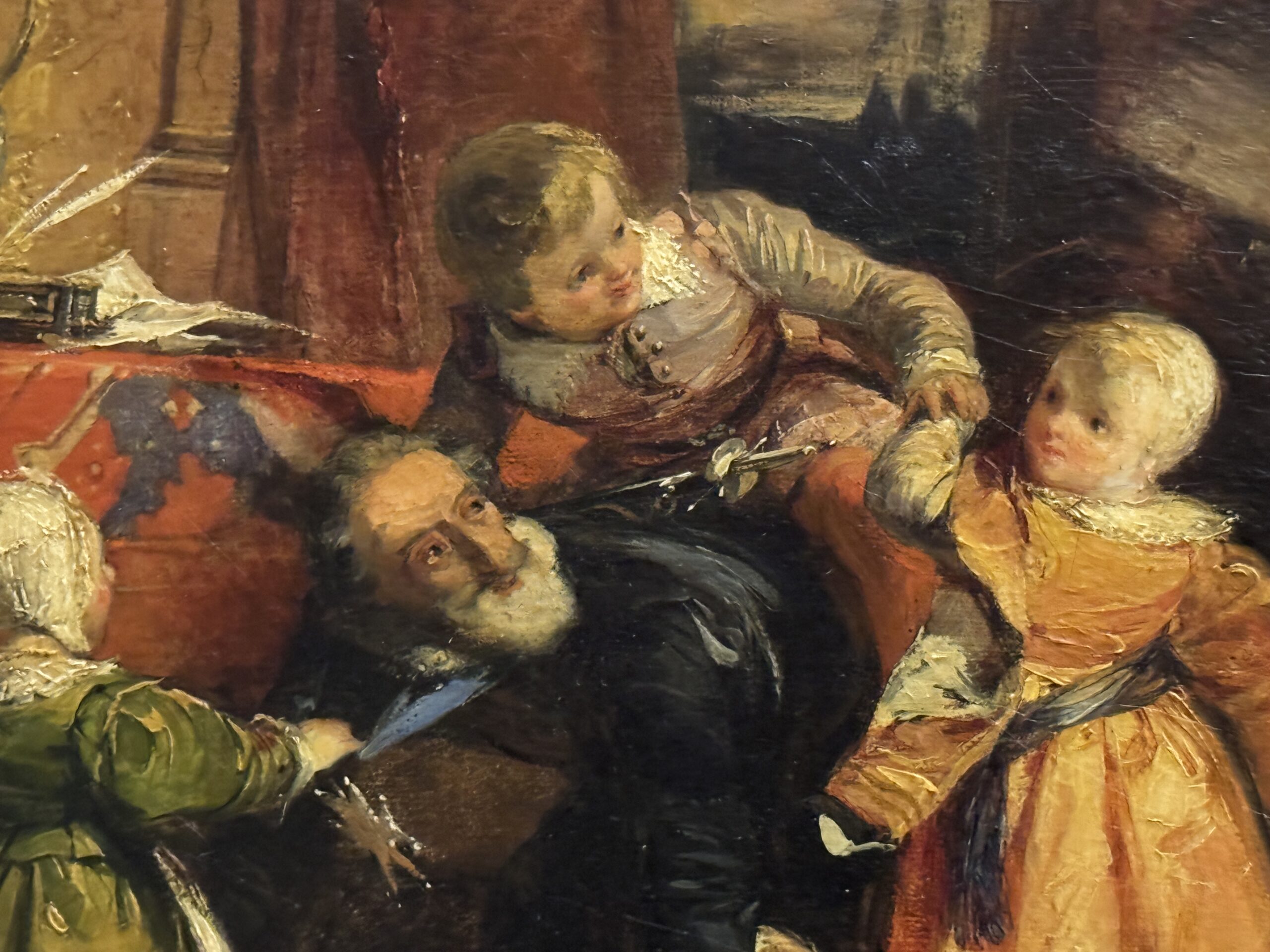 Подобные сюжеты показывали Генриха — представителя вернувшейся к власти династии Бурбонов — как доброго короля, человечного и доброго отца. В зарождающуюся эпоху романтического отношения к семье и детям требовался не опасный диктатор, но человек живой, весёлый, противостоящий условностям. Роль отца важнее роли монарха, наследник-будущий король уже в седле, доспехи в углу, легитимизация через уют, королева — не опасная манипуляторша-интриганка, как будущая коварная Мария-Антуанетта, а на втором плане, в тени… какая многослойность! Мы хорошо знаем это по Ленину и детям, Сталину и детям, Путину и детям (живот мальчика Никиты)…