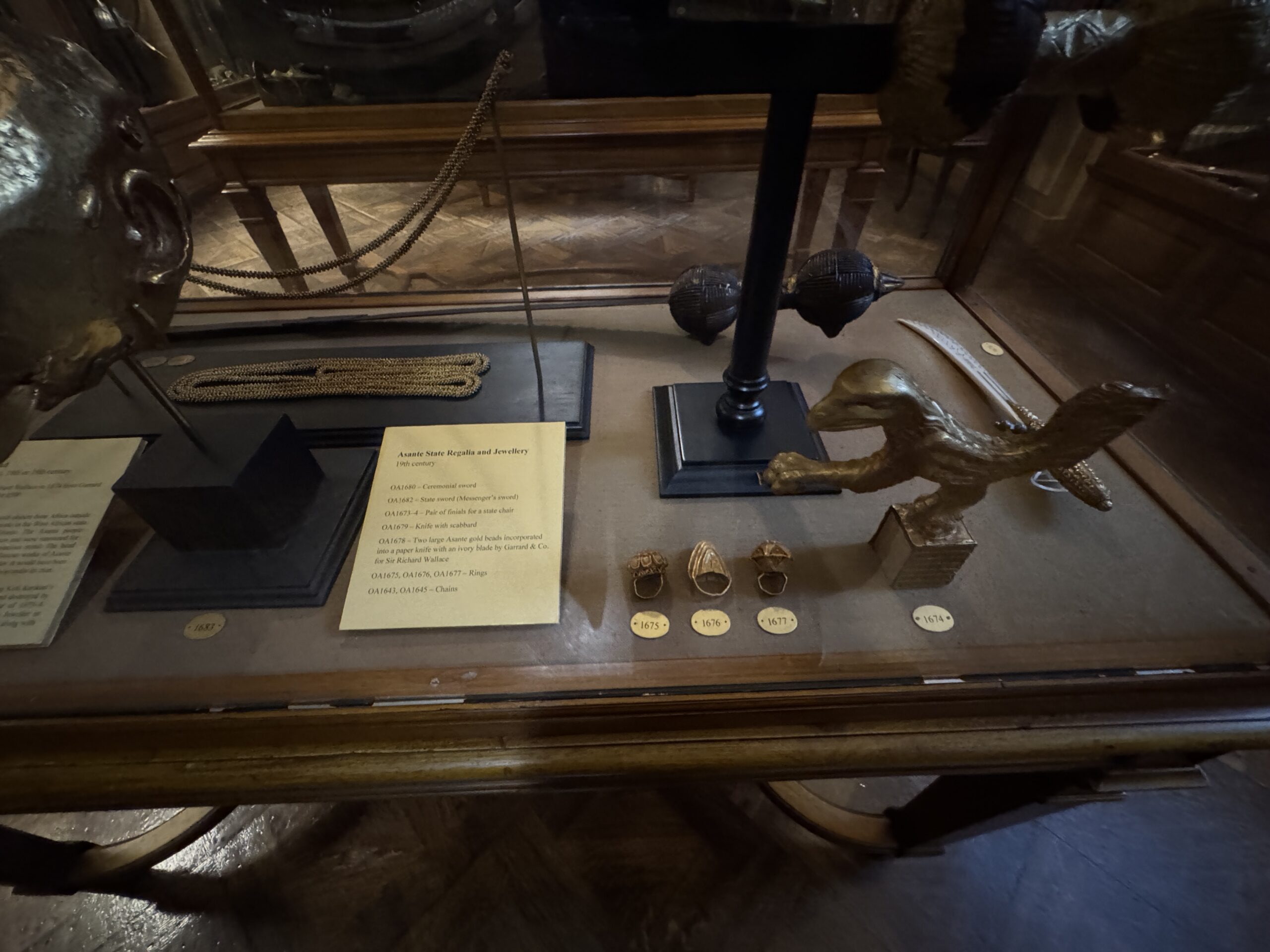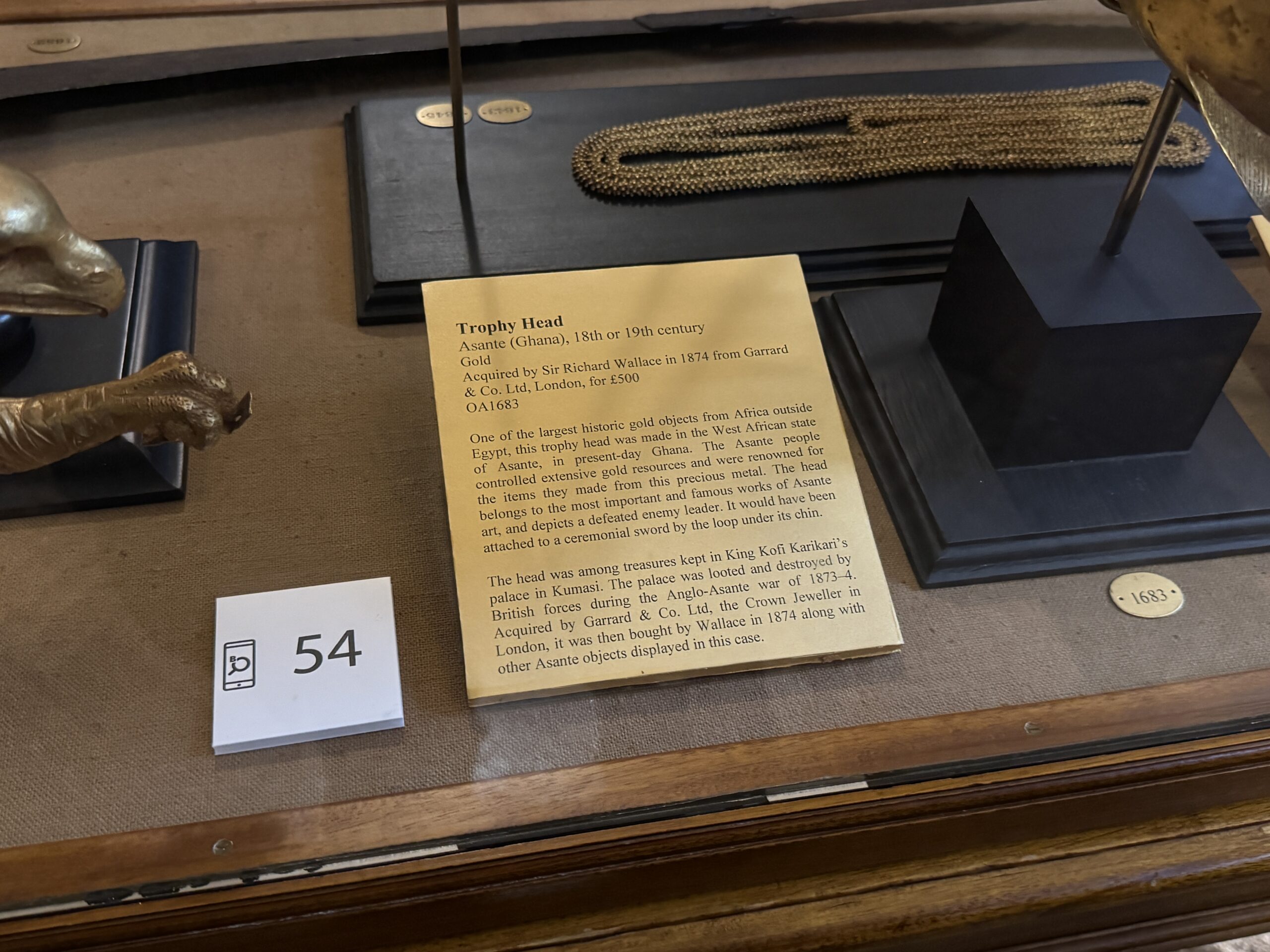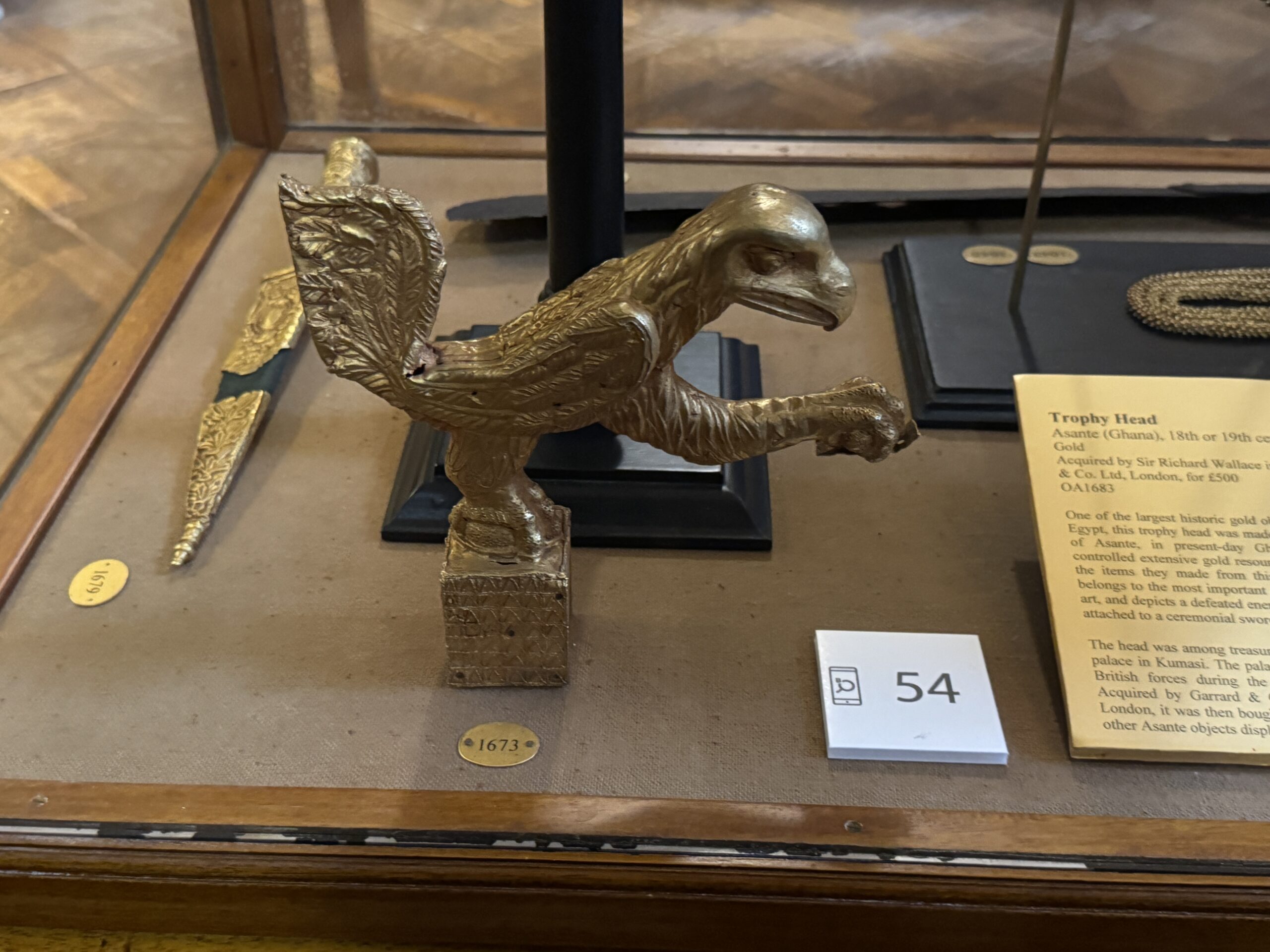 Султан Типу, «Тигр Майсура», был самым яростным противником британцев в Индии. Почитайте, как самоотверженно и изобретательно сражался за свободу своей земли тот человек. Расположение меча султана в зале — это визуальный рассказ о победе Британии над сильным врагом. Для посетителя XIX века это был не просто «красивый нож», а символ того, что Индия теперь принадлежит короне. Равно как выставляя золото побежденного африканского короля Ашанти в Лондоне, Уоллес транслировал мощь империи, способной забрать самое ценное у другого монарха в качестве наказания или трофея.